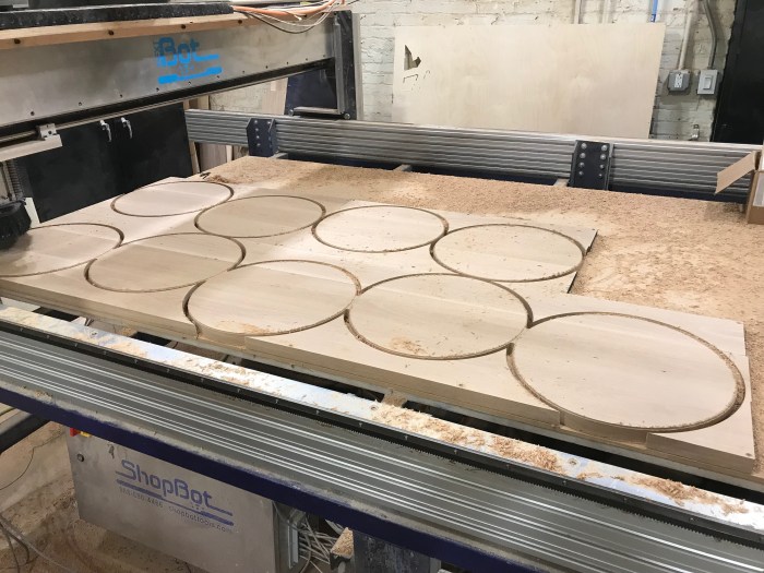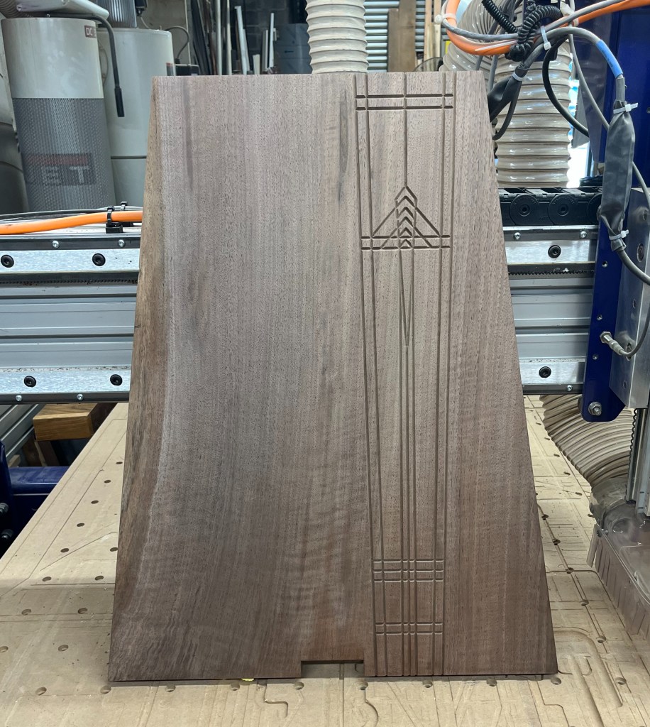 Winery logo being CNC engraved on a 4′ black walnut top. (Not our primary customer, nor design.)