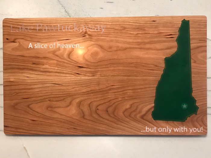 Engraved and inlayed breadboard produced on the CNC. Board is purple heart with cherry inlay.