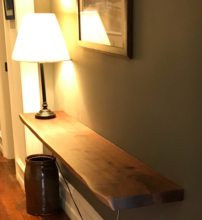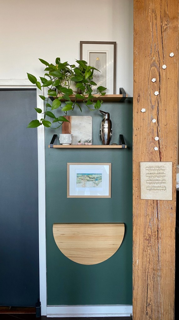 Space-saver drop-leaf desk / serving shelf with upper shelves all made from repurposed American Chestnut pews