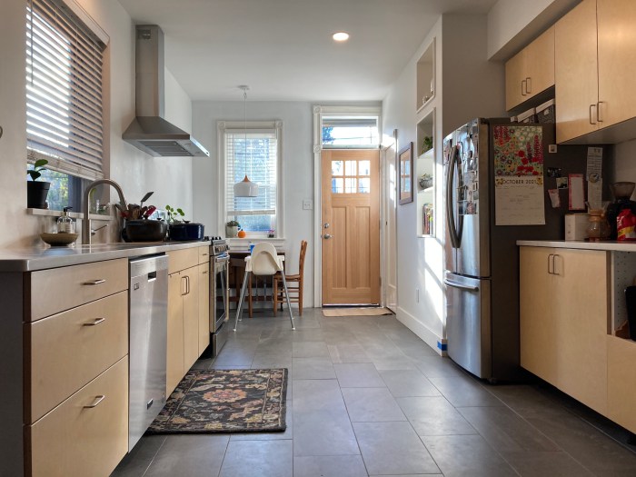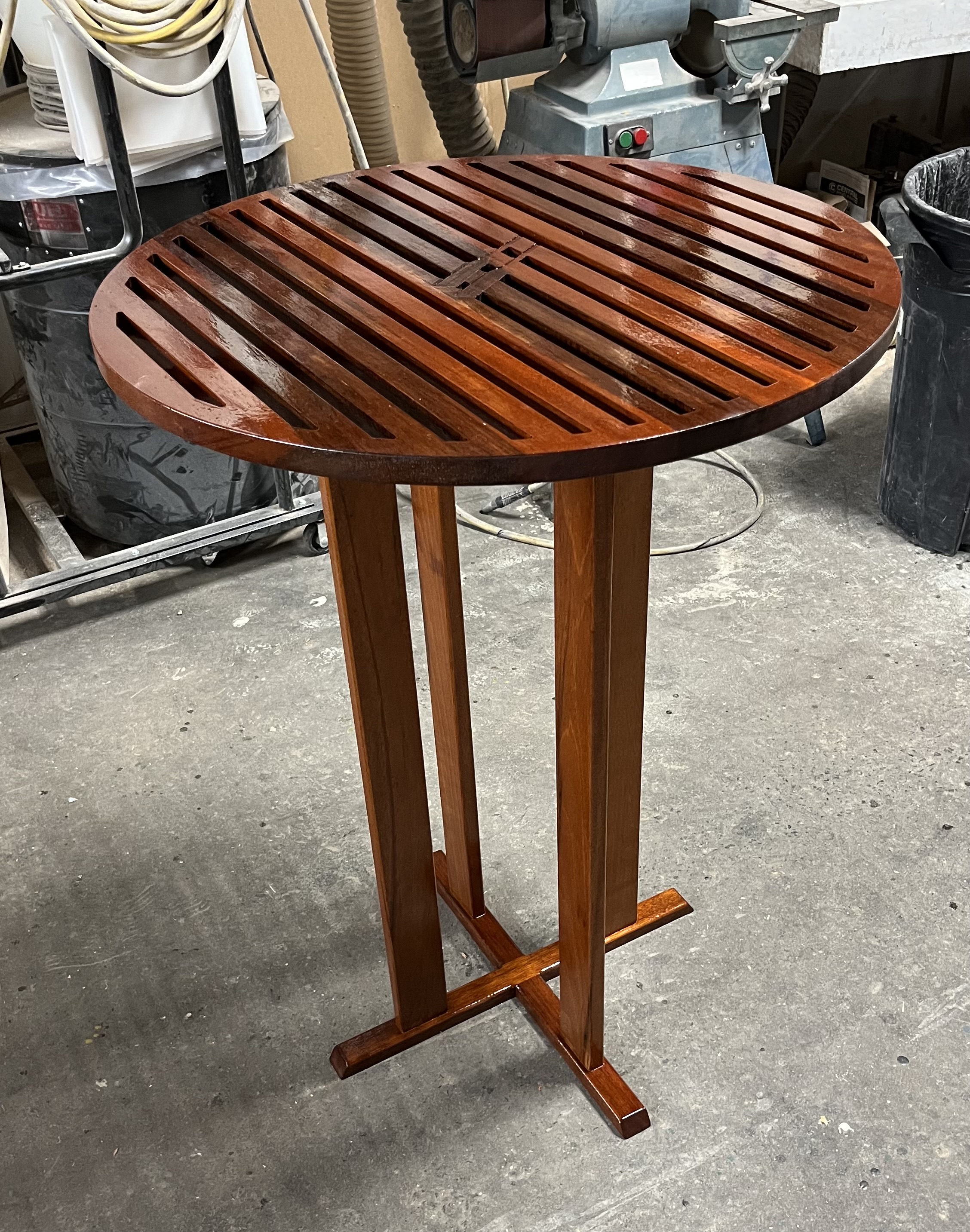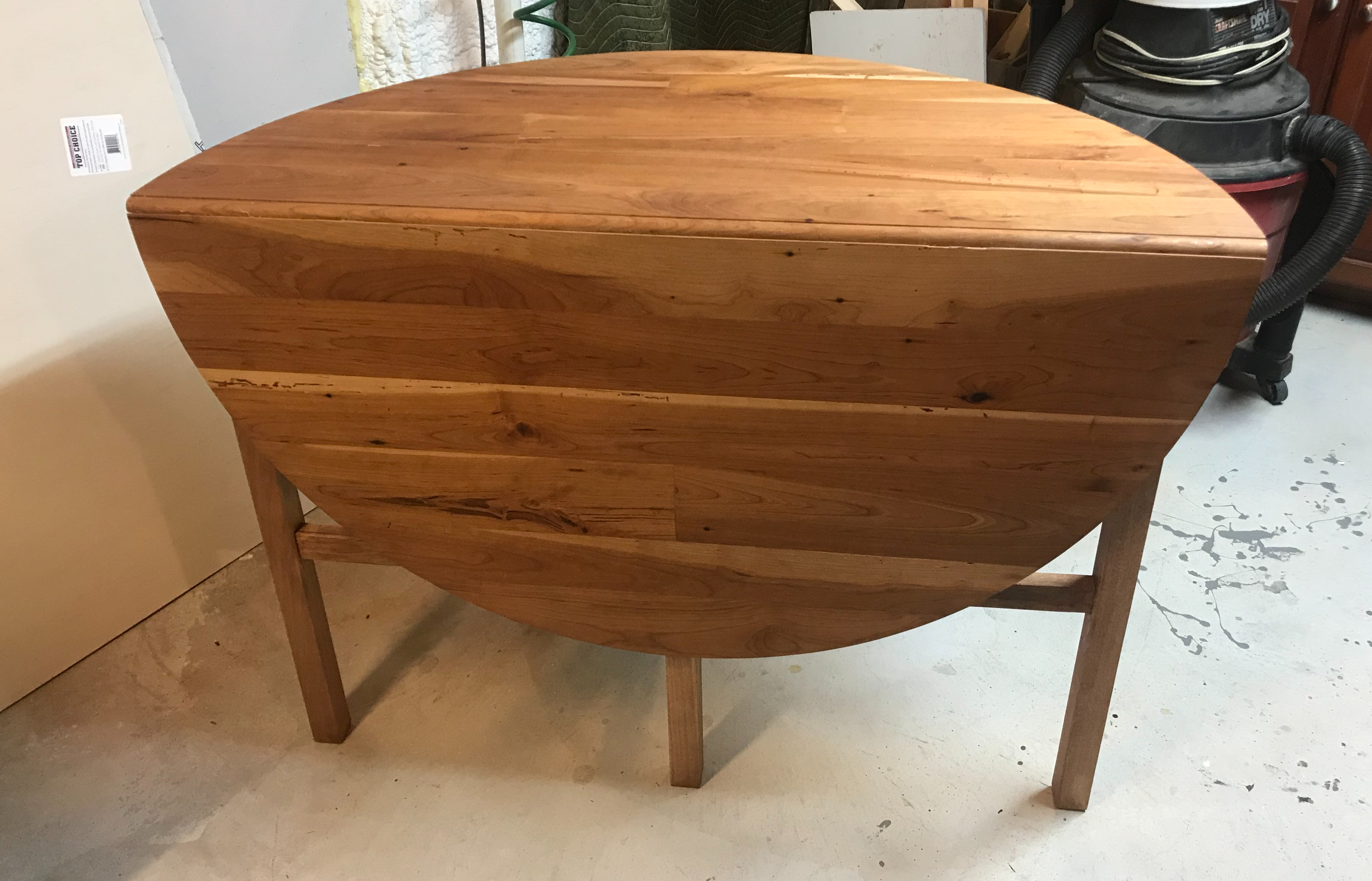 Drop-leaf table from repurposed cherry decking – Center leg slides in/out to create support