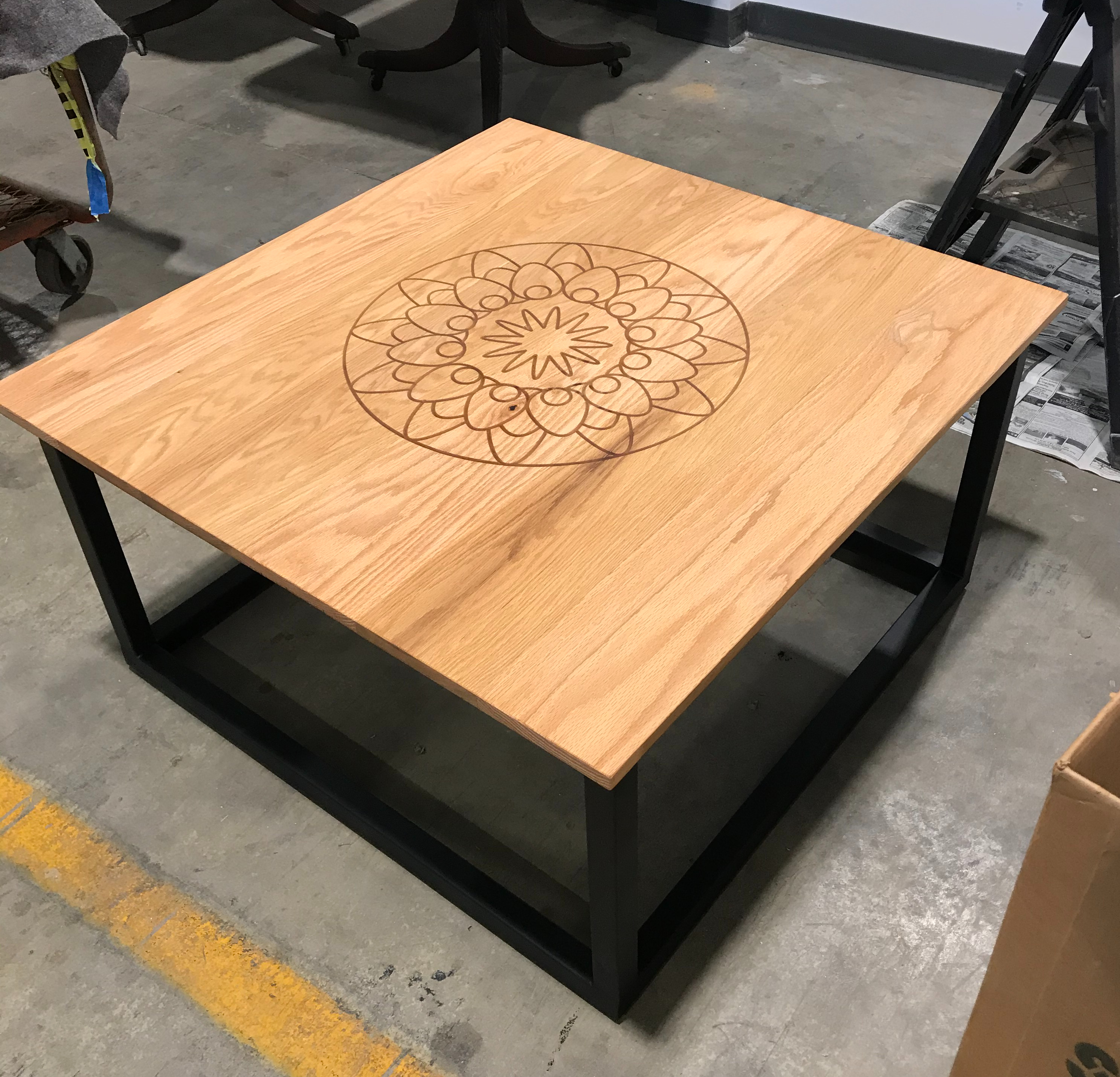 Reclaimed oak coffee table with CNC engraved and epoxy filled mandala.
