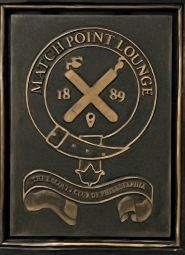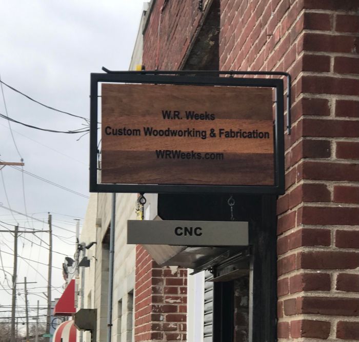 Shop sign on repurposed mahogany in steel frame. Drop-down on PVC board. CNC produced.