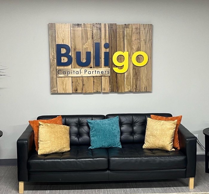 Lettering mounted on repurposed pallets -consistent with client branding strategy.