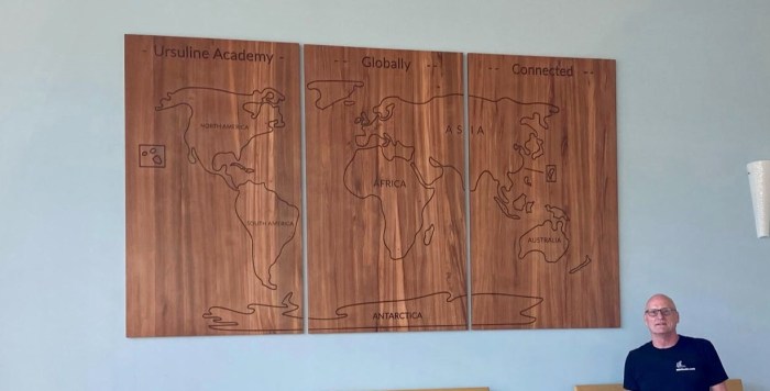 6 ft. x 10 ft. Map of the Continents from repurposed cherry church pews. Engraved on the CNC.