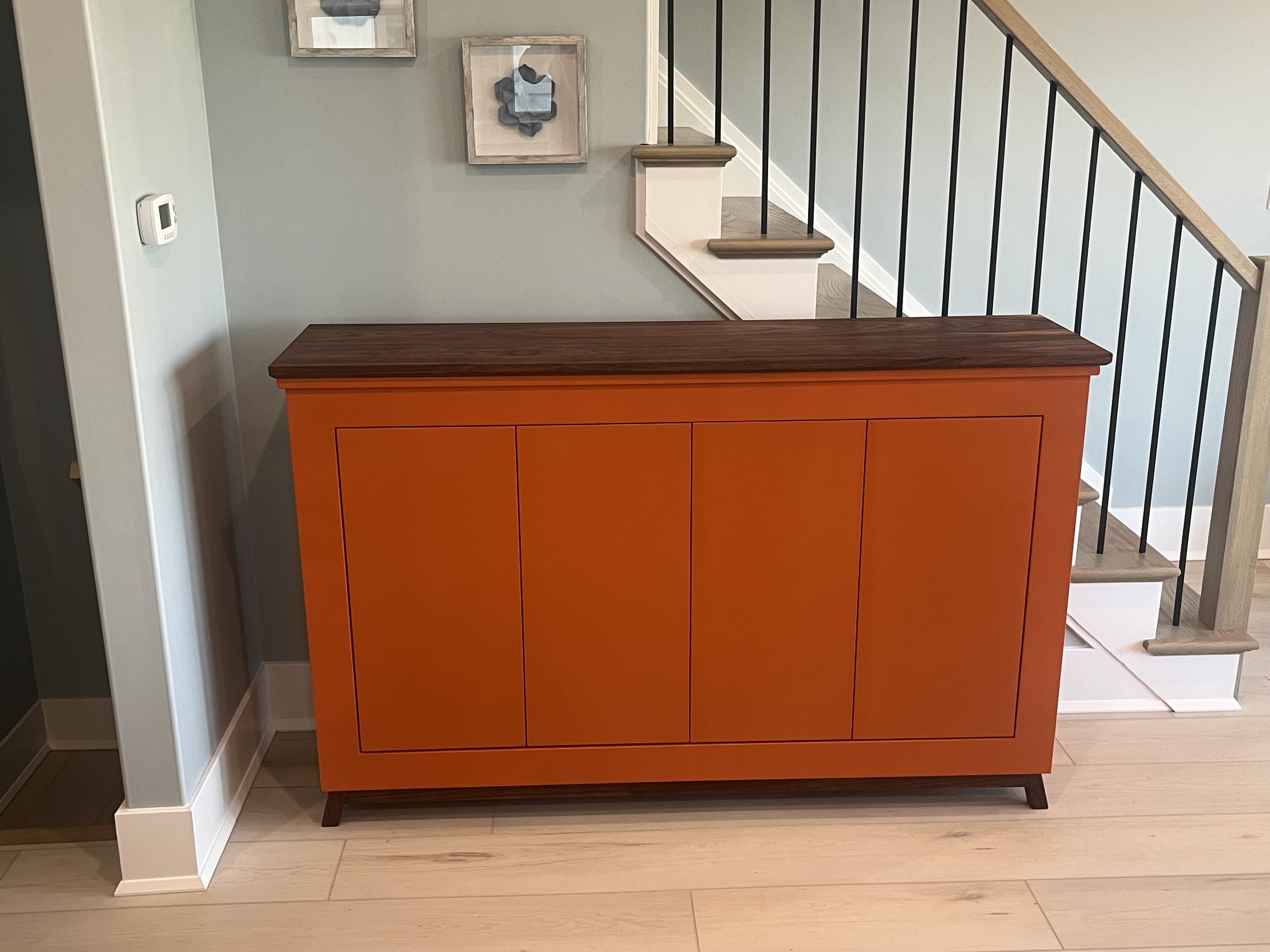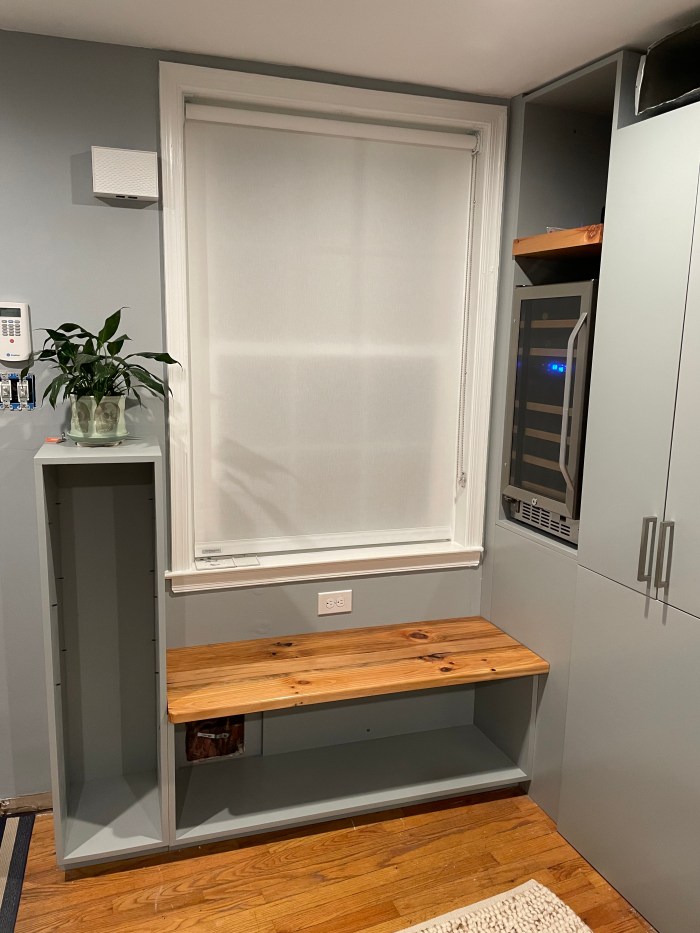 Entryway shoe cabinet (sans shelves and door), bench with fireplace wood storage, wine cabinet, upper storage shelf, and coat closet