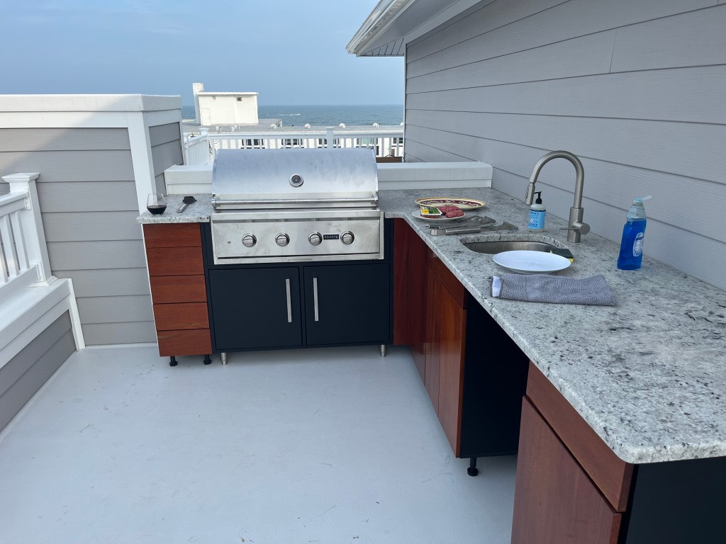 Mahogany outdoor kitchen with black pressed pvc cabinet boxes. Door and drawer pulls and wine frig. pending.