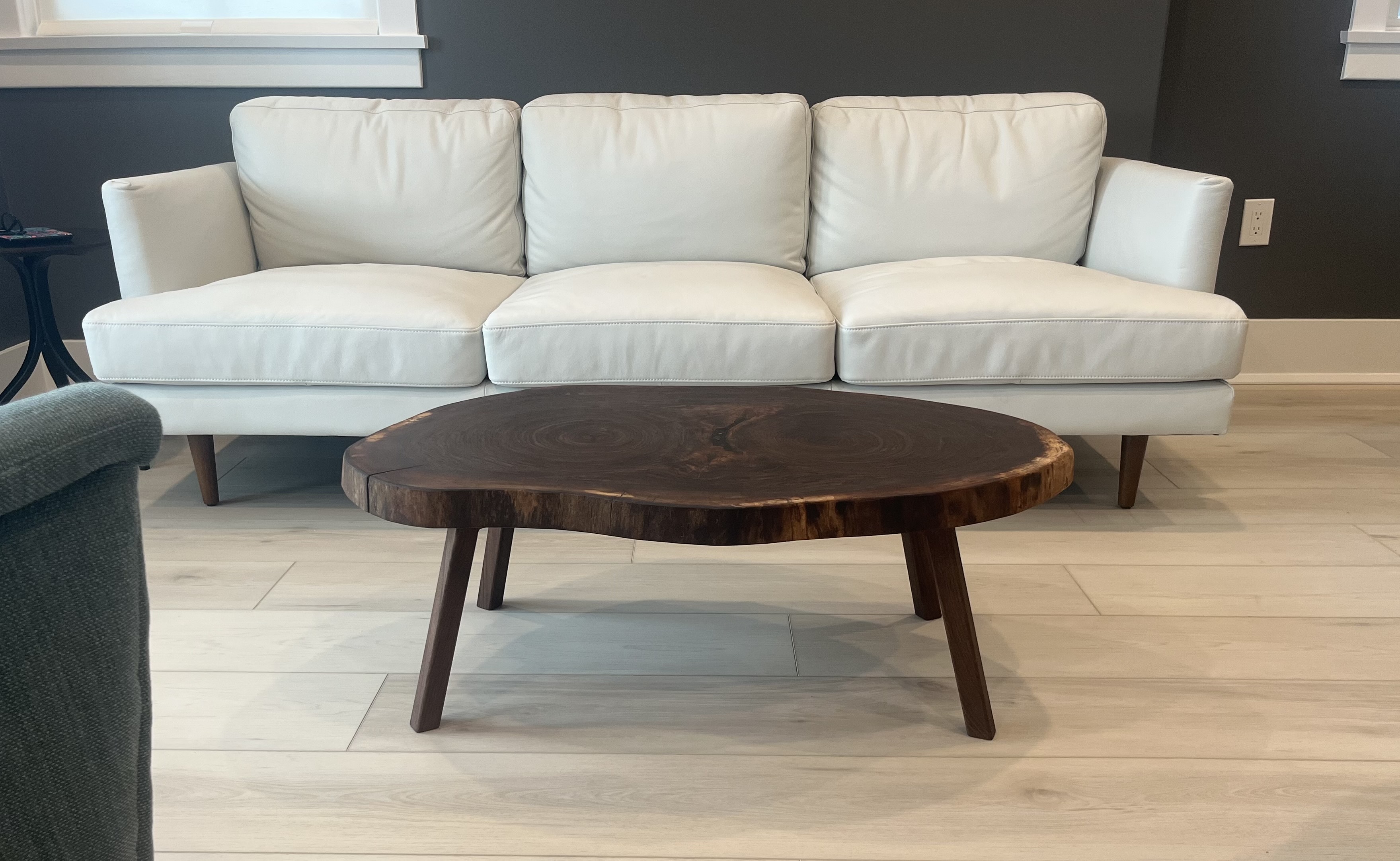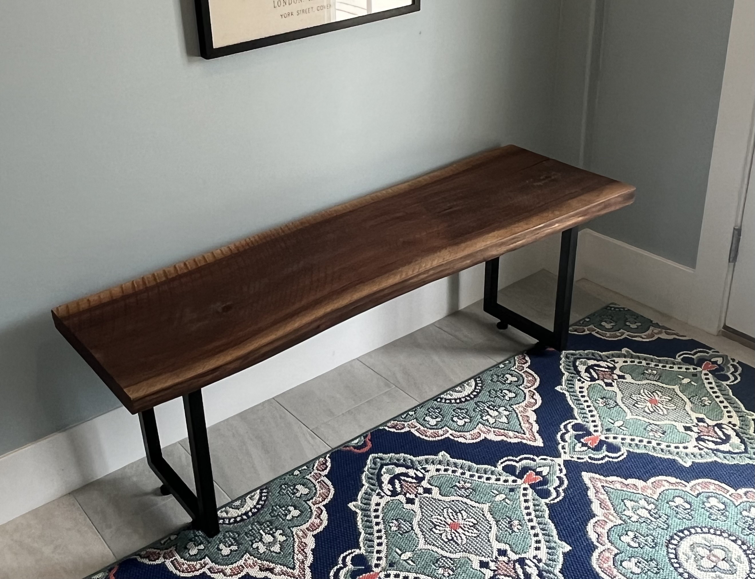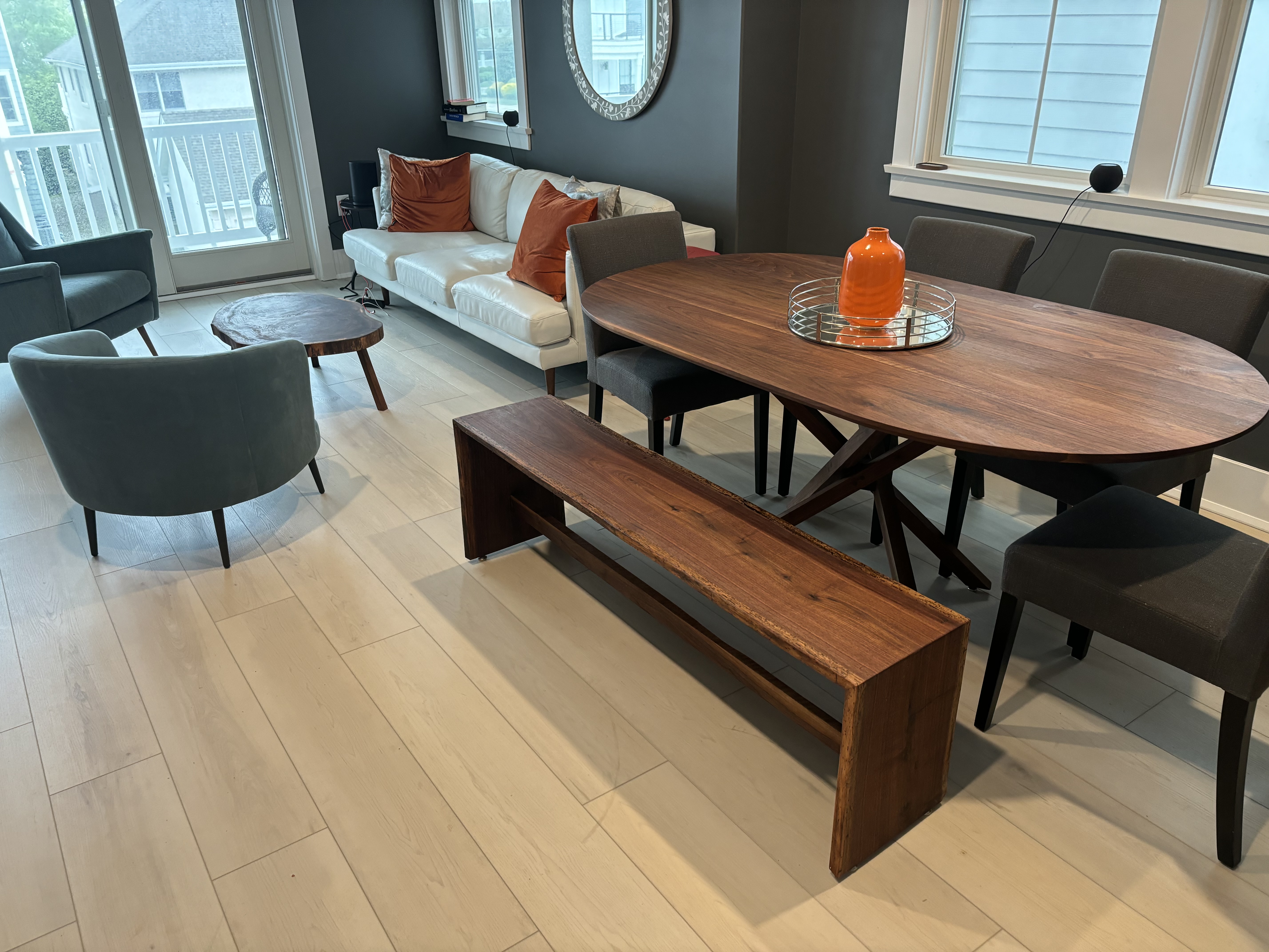 Black walnut table with spider legs. Shown with waterfall live-edge bench and matching cookie slab coffee table.